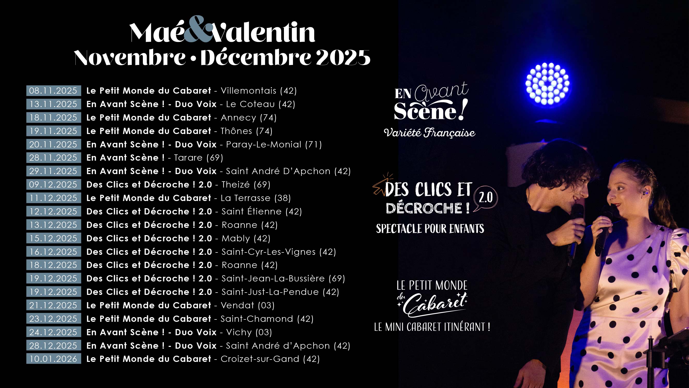 Nous sommes deux jeunes chanteurs de Roanne, dans la Loire (42), passionnés par la scène et la chanson française à texte. Entre concert tout public, spectacle pour enfants et mini cabaret itinérant, nous proposons des prestations variées pour toutes les occasions. Nous travaillons avec des professionnels, comme des entreprises, programmateurs ou collectivités, mais aussi avec des particuliers pour des mariages, cocktails ou soirées privées. Depuis notre création en 2021, nous avons été programmés dans de nombreux festivals, saisons culturelles et fêtes locales. Sur scène, notre objectif reste simple : faire passer un bon moment à tous les publics.